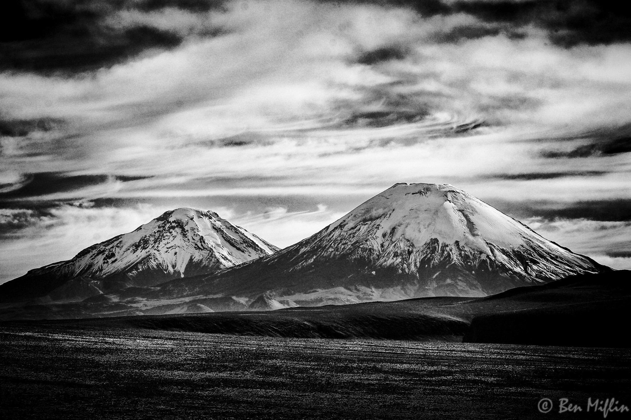 The Payachatas snow-capped mountains (from Aymara: payachata ‘twins’) are a group of two active volcanoes, composed of the Parinacota, on the left, and the Pomerape, located on the border that divides Bolivia and Chile.