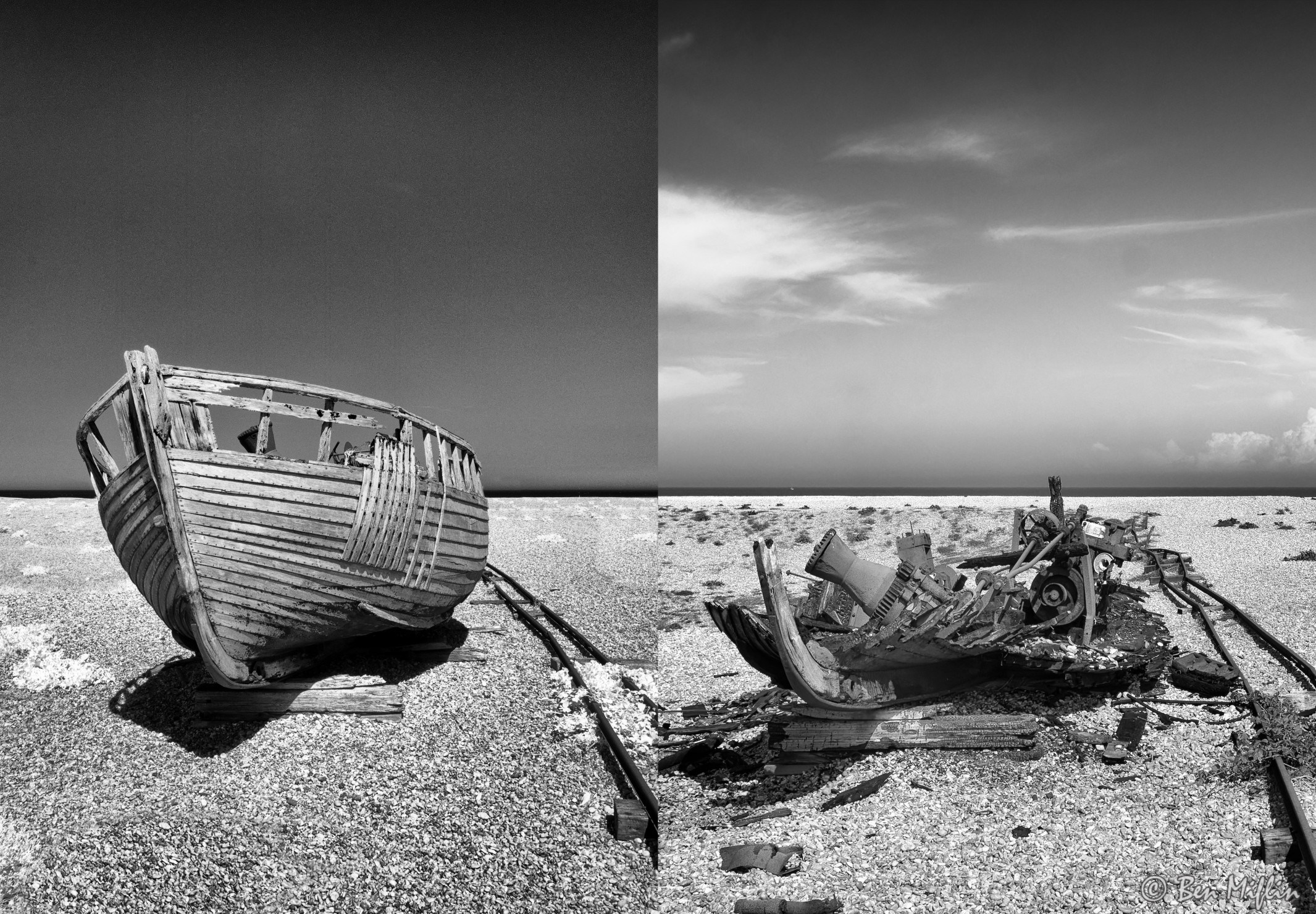 There’s something distinctly surreal and otherworldly about Dungeness. It is a place where history seems to accumulate and is left to decay. This applies to old boats or the radioactivity in the decommissioned nuclear power stations. It has the largest expanse of shingle in Europe which continues to grow as it is deposited by the sea. It is a haven for wild life and over 600 species of plants. Over the years it has attracted artists like Derek Jarman and been called a ‘photographers dream’. I have tried to scratch the surface with my photographs here.