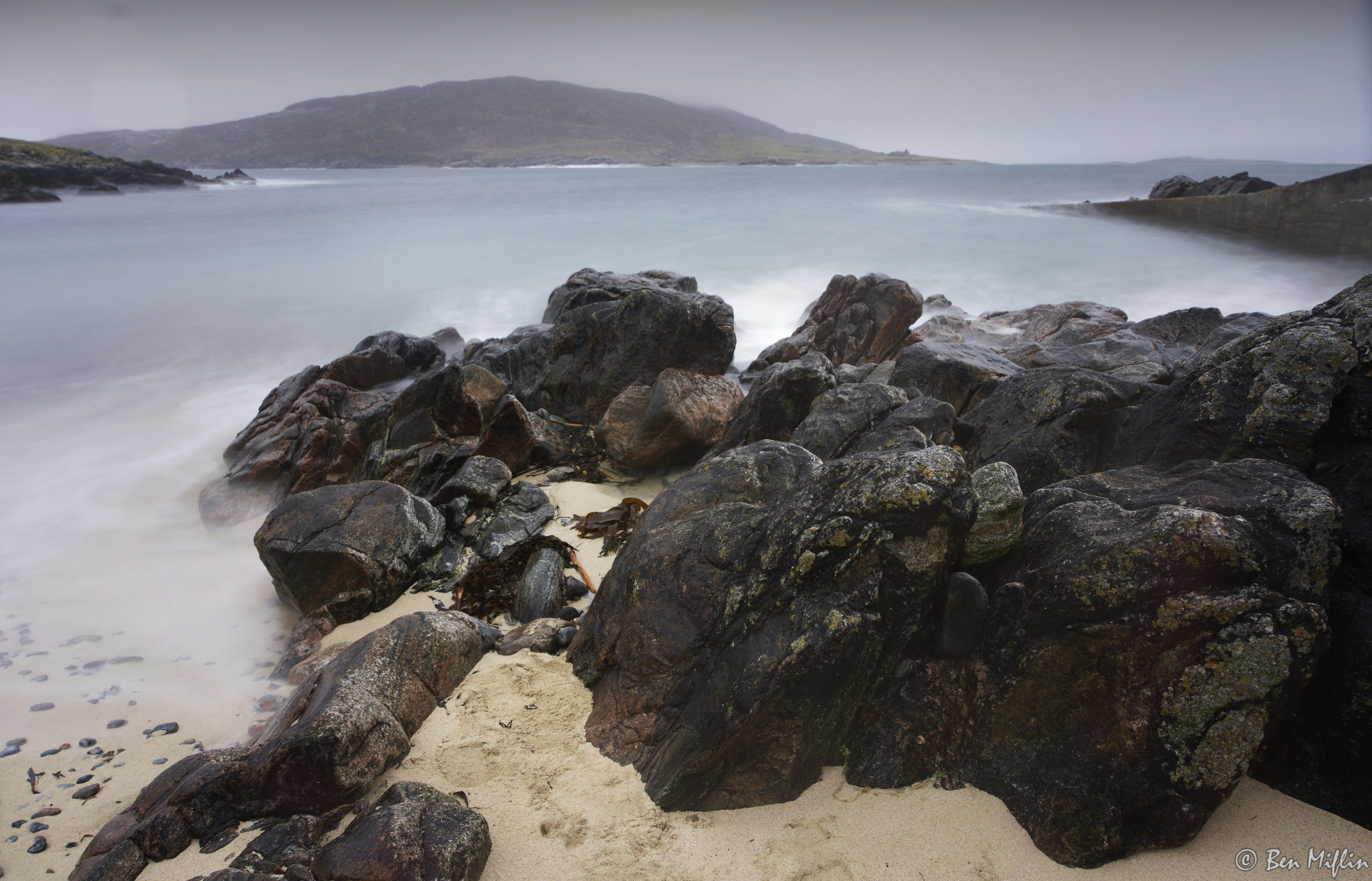 Coastal Rocks at Hushinish and the island of Scarp in the backgtound.