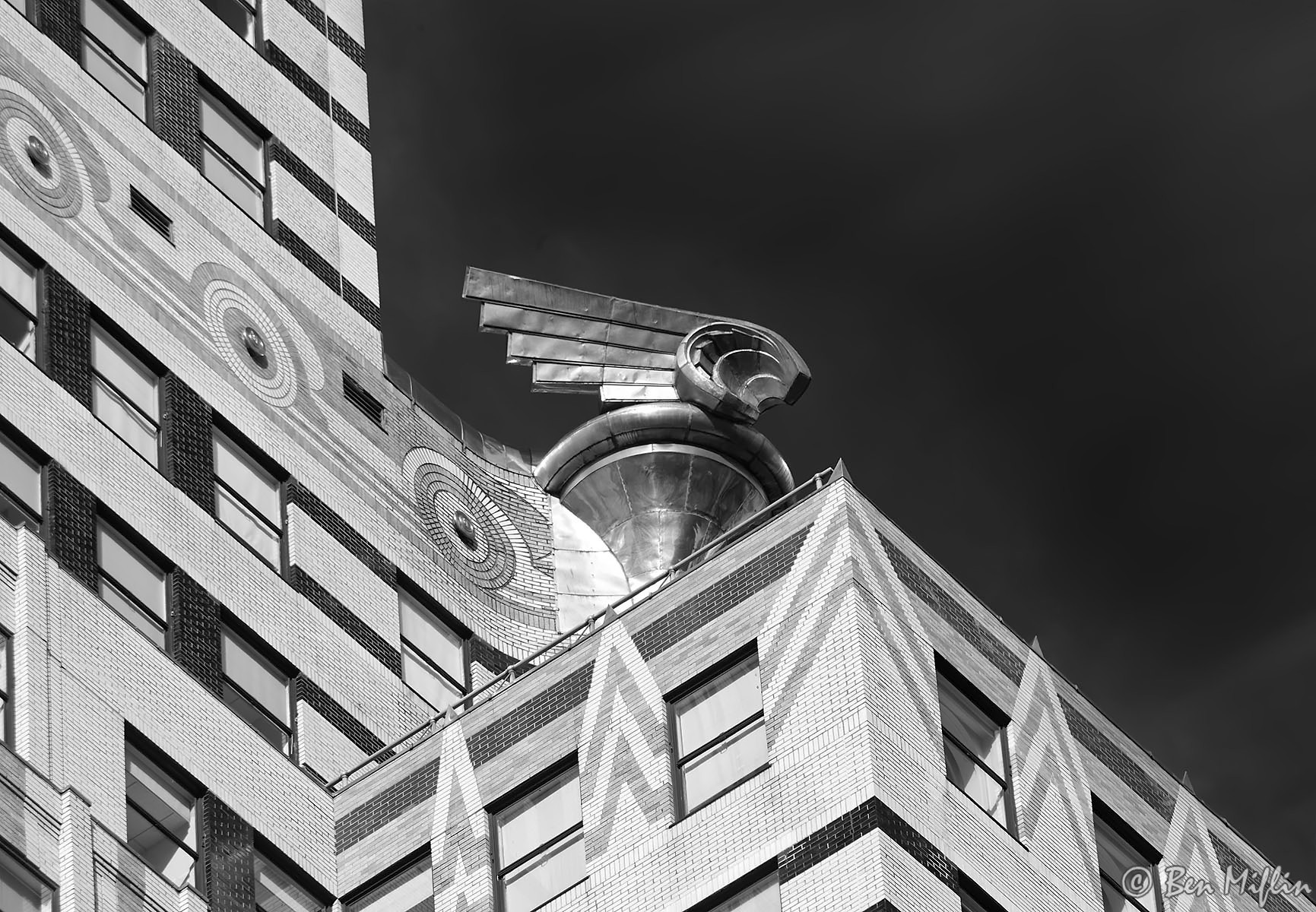 Detail of the Chrysler Building showing one of the gargoyles model in the style of a Chrysler car hood ornaments.
