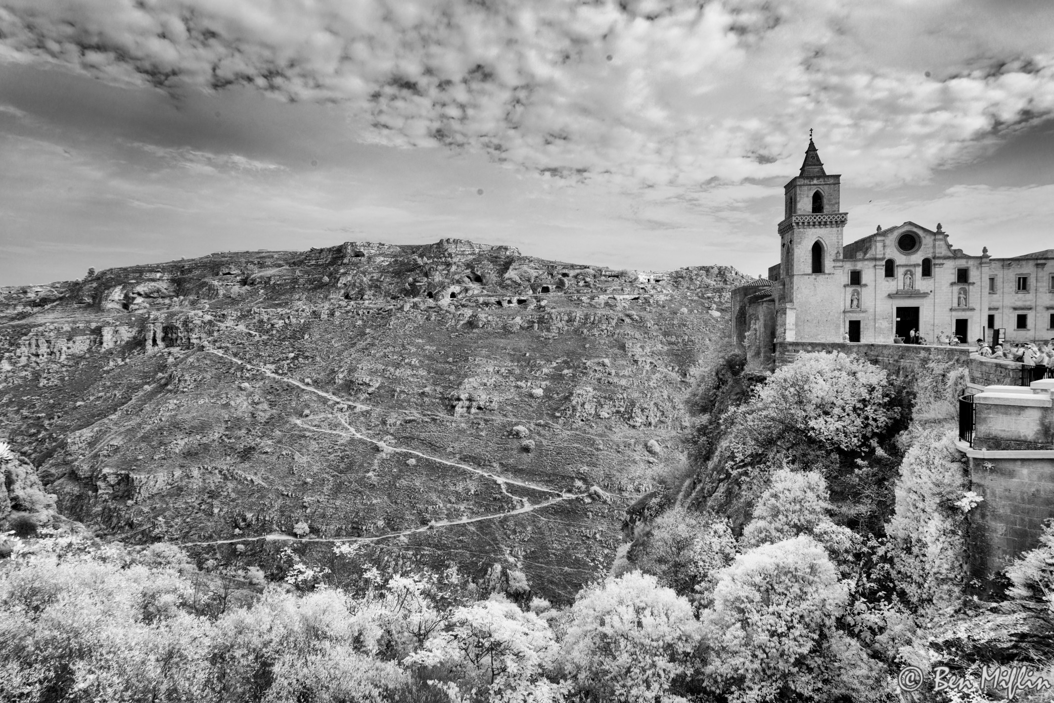 St Peter Caveoso. Iin the background are the caves of the Parco della Murgia on the Eastern bank of the Gravina river.