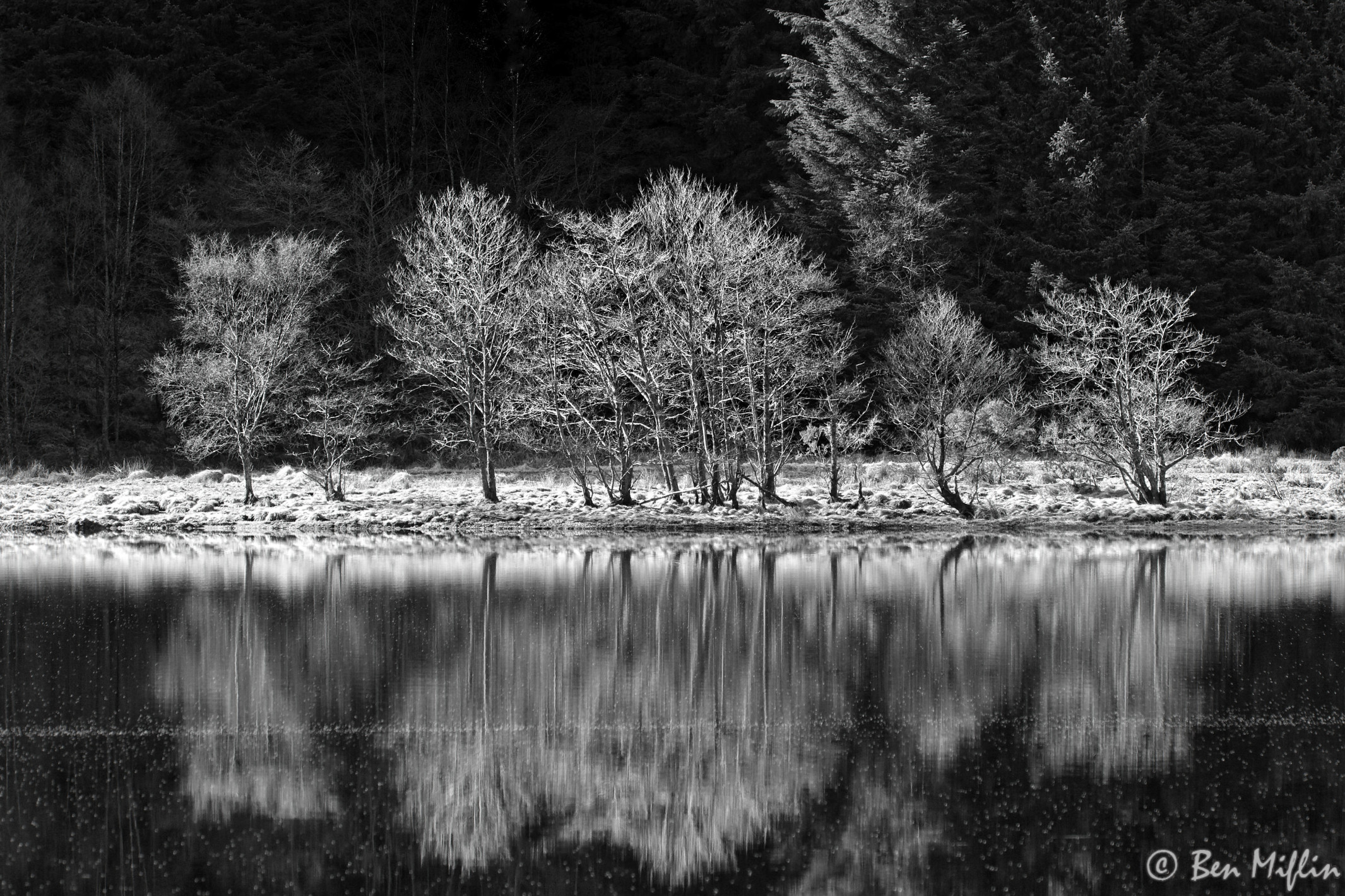 Early morning light on trees on the banks of at Loch Doine in Scotland