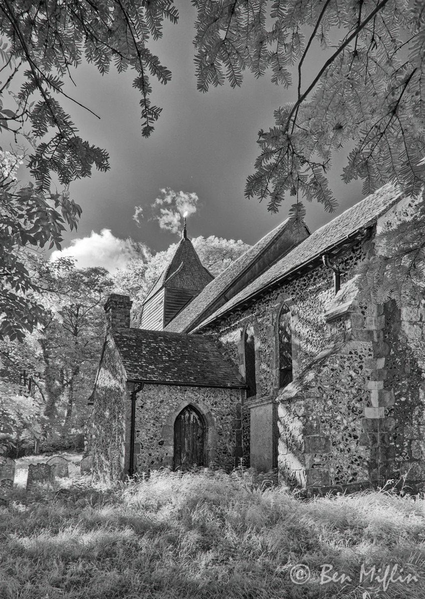 St Peter ad Vinicula Church, Folkington. Old box-pews survive inside, and Viscount Monckton has a memorial stone.
