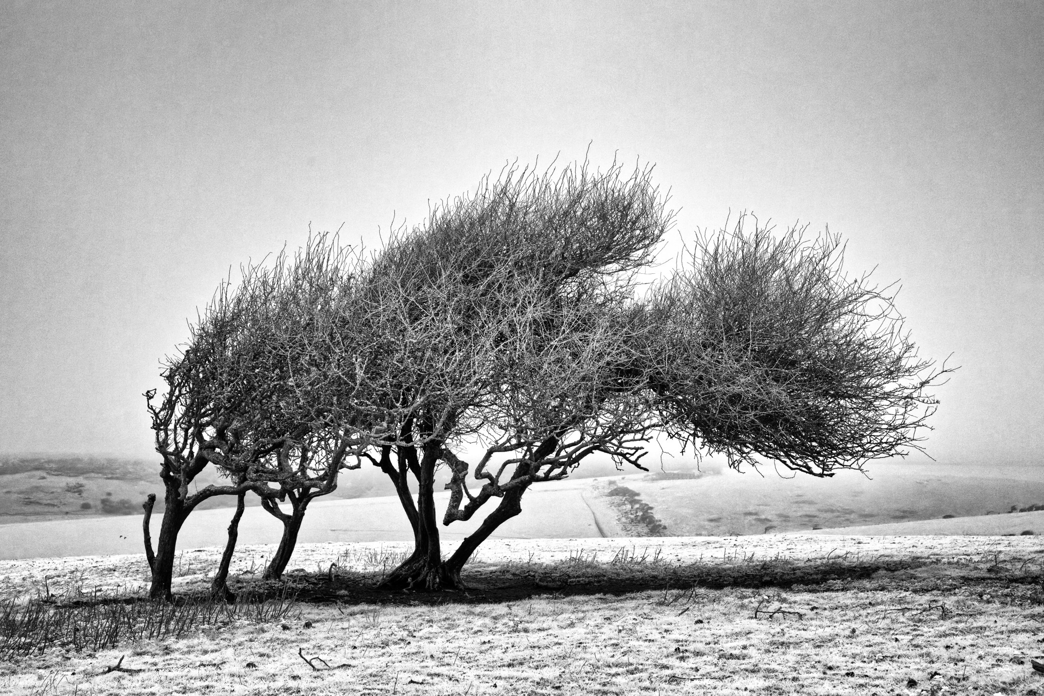 Windswept trees in the mist above Crowlink